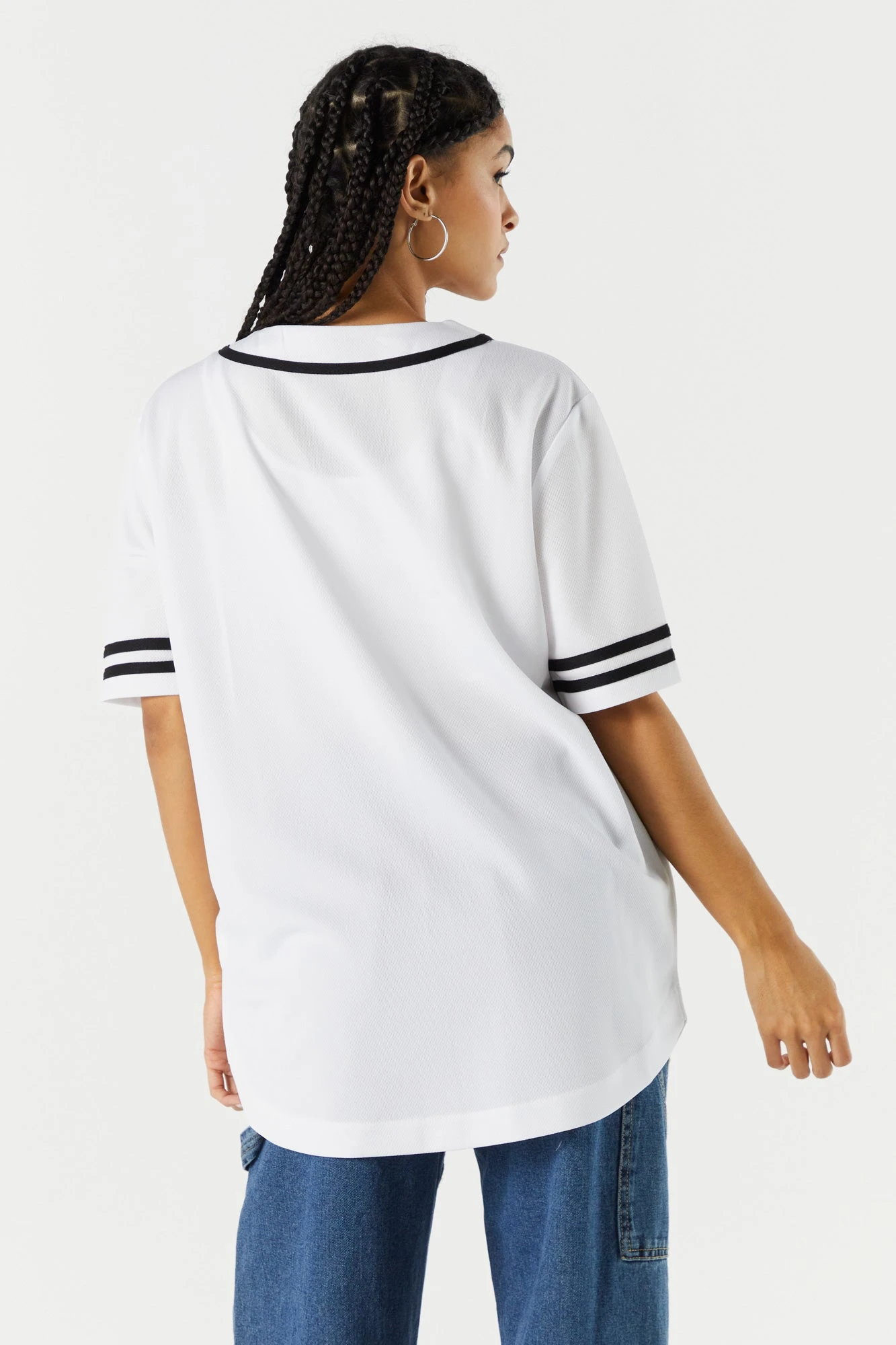 Take me out to the ballgame! This baseball jersey never misses. This jersey features contrast stripe hem, button-up front, short sleeves, front graphic and V-neckline. Size runs small.