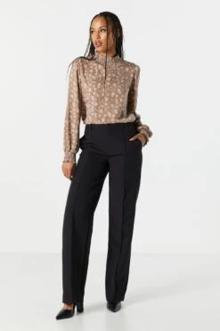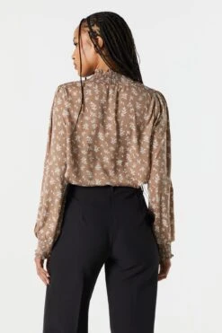 Brown Floral Mock Neck Blouse