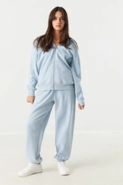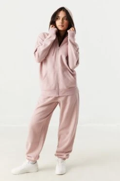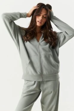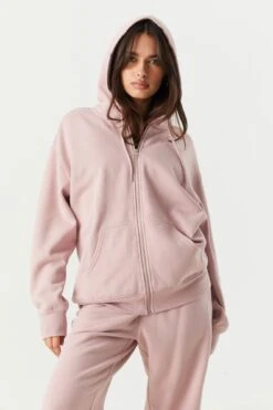Kick back and get comfy in our oversized zip-up hoodie. This hoodie features fleece material, drawstring hood, zip-up front, long sleeves, ribbed knit cuffs and hem, and oversized fit.