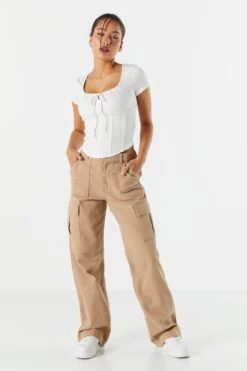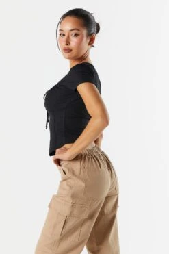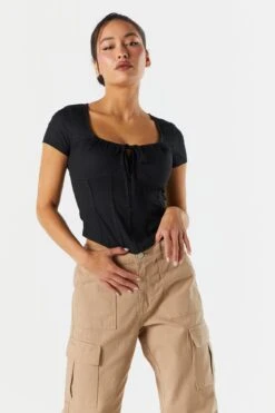 Your weekend wardrobe called… It wants this top! This tank features corset construction, short sleeves, front tie detail, and cropped hem. Size runs small.