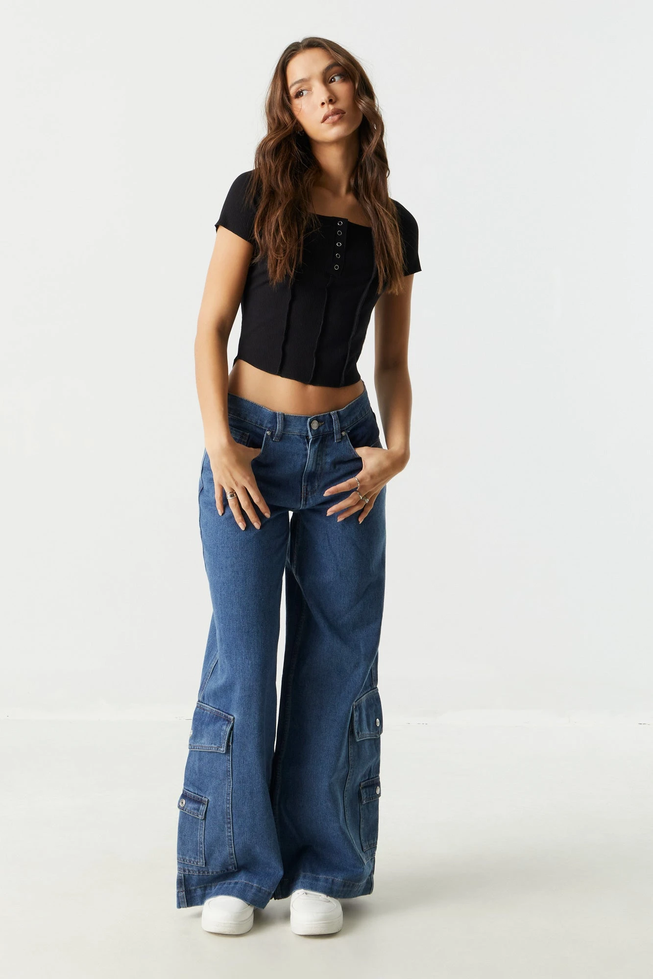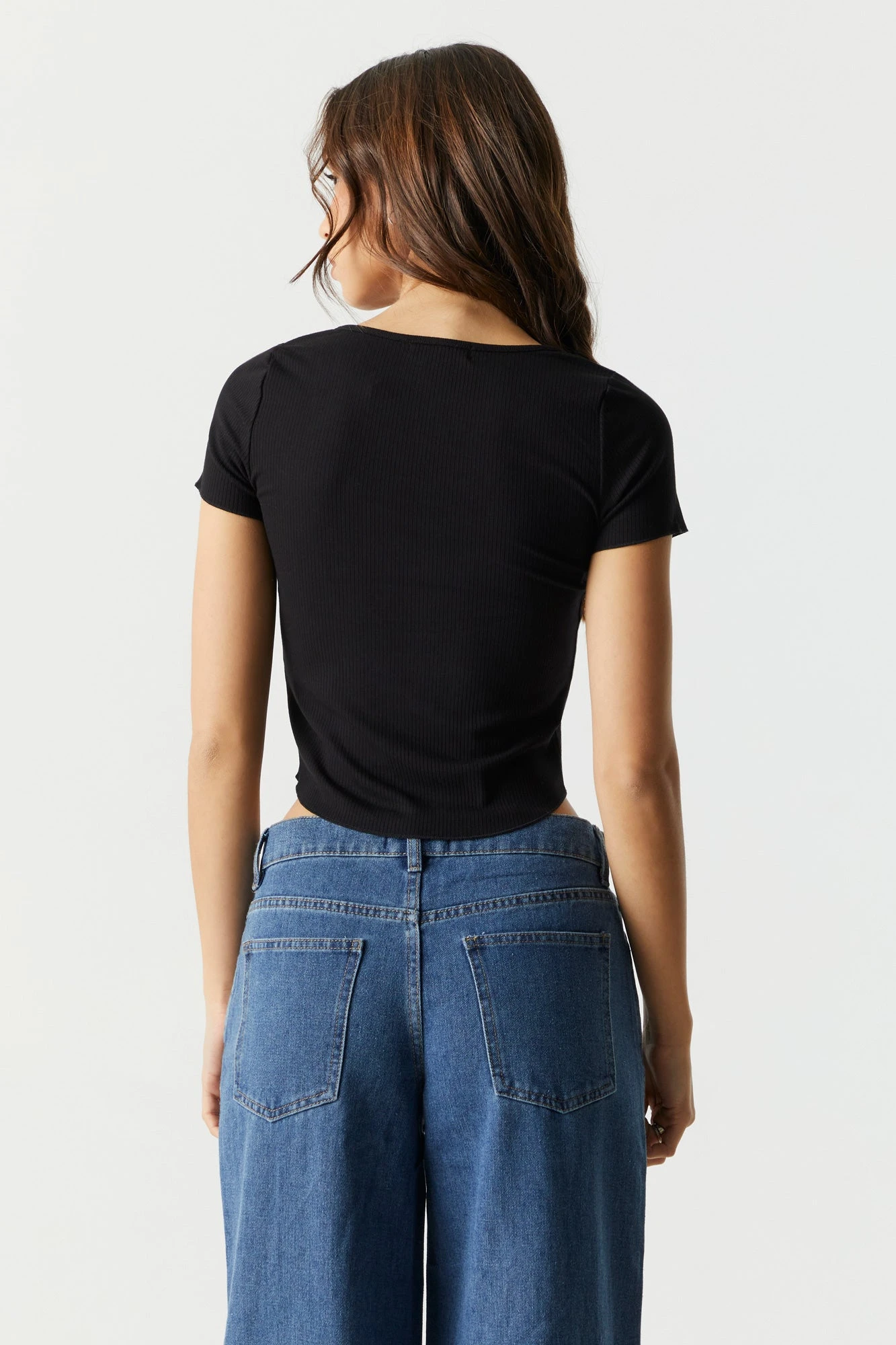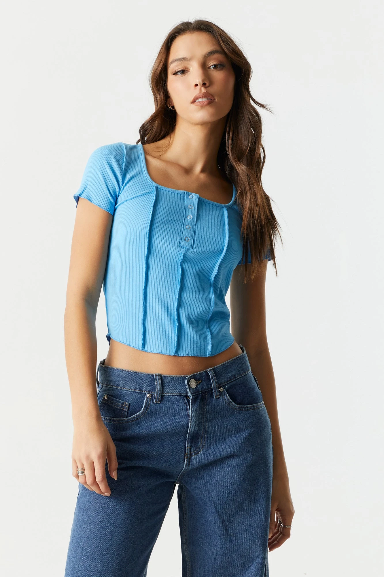 This top features henley neckline, short sleeves, skimmer waist, ribbing and exposed seam. Size runs small.