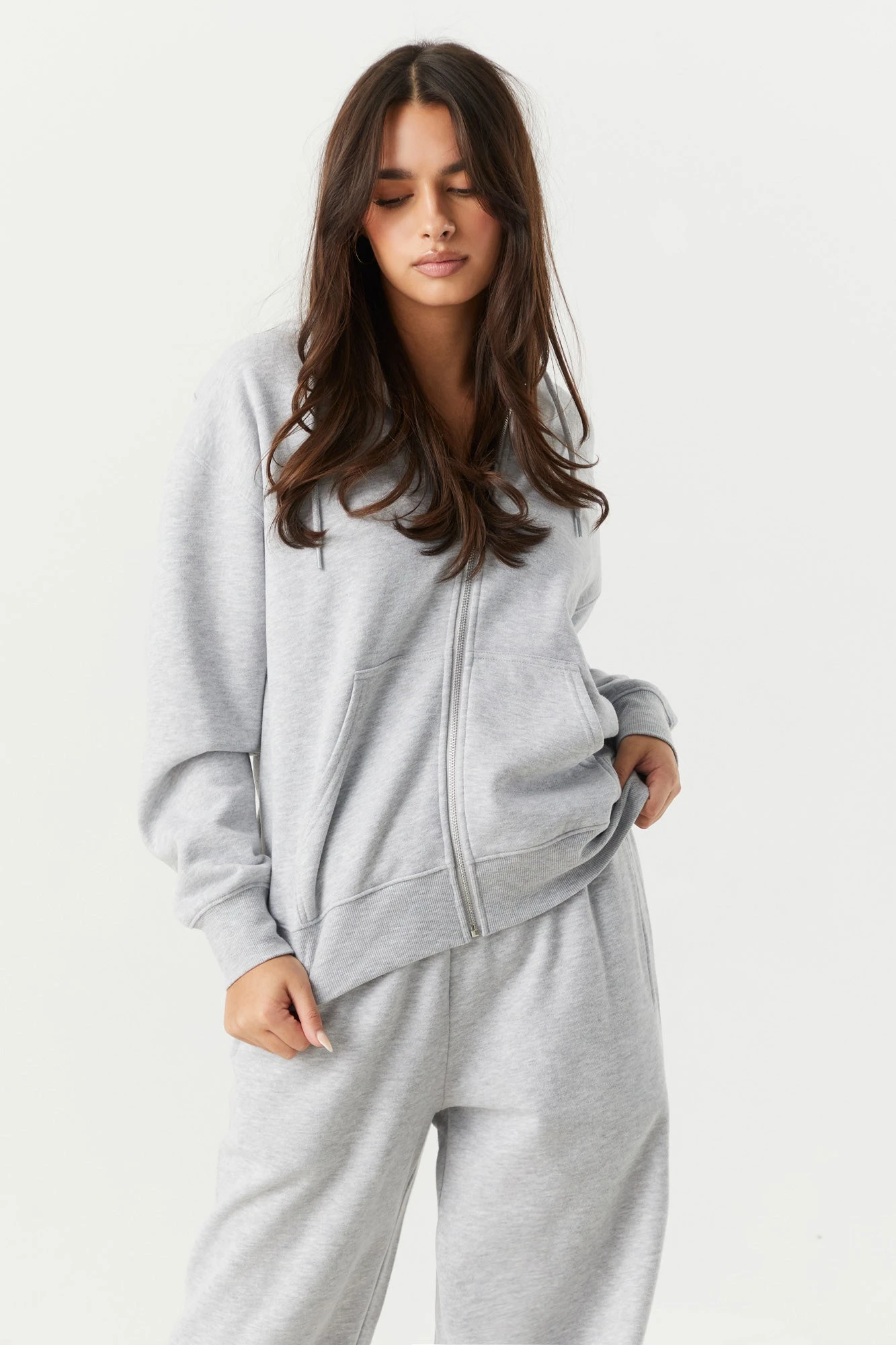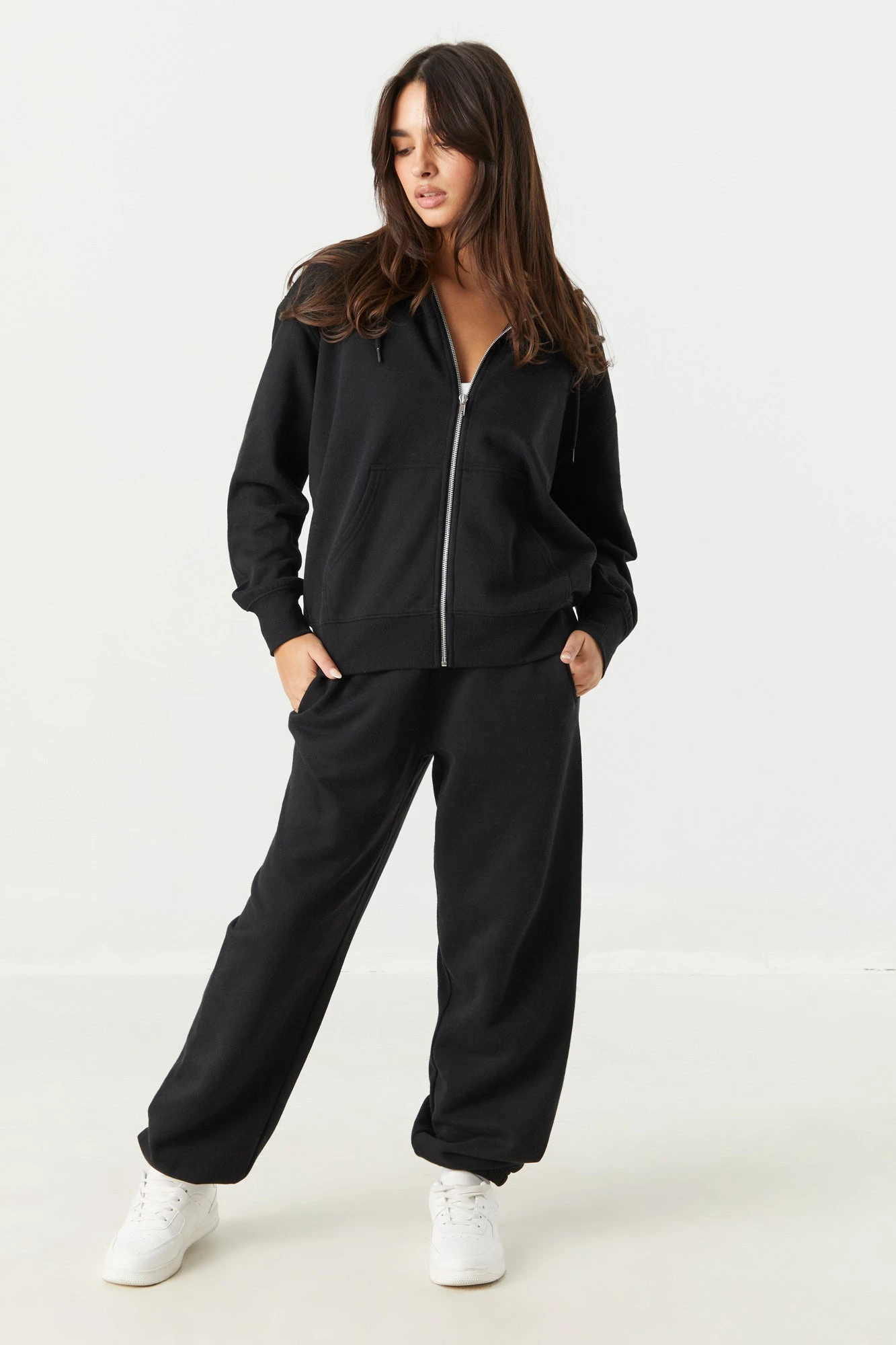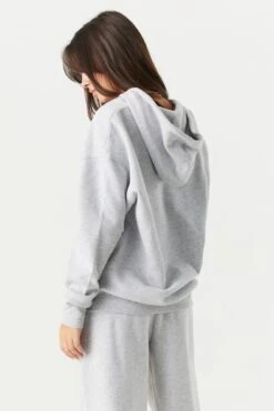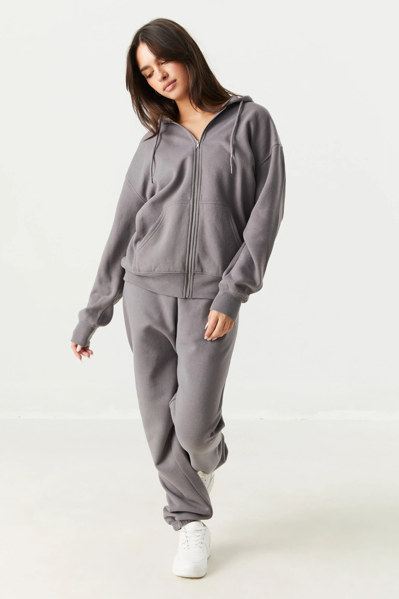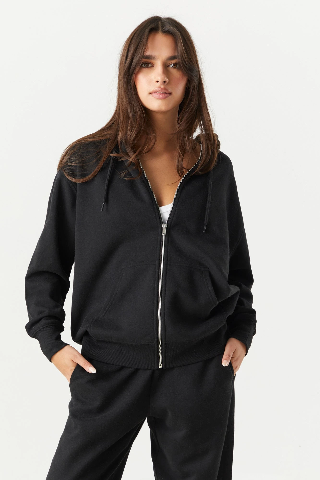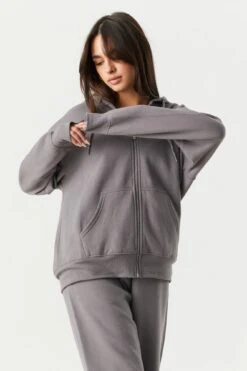 Kick back and get comfy in our oversized zip-up hoodie. This hoodie features fleece material, drawstring hood, zip-up front, long sleeves, ribbed knit cuffs and hem, and oversized fit.