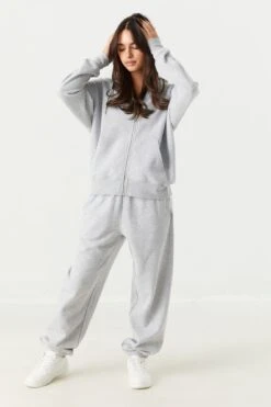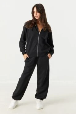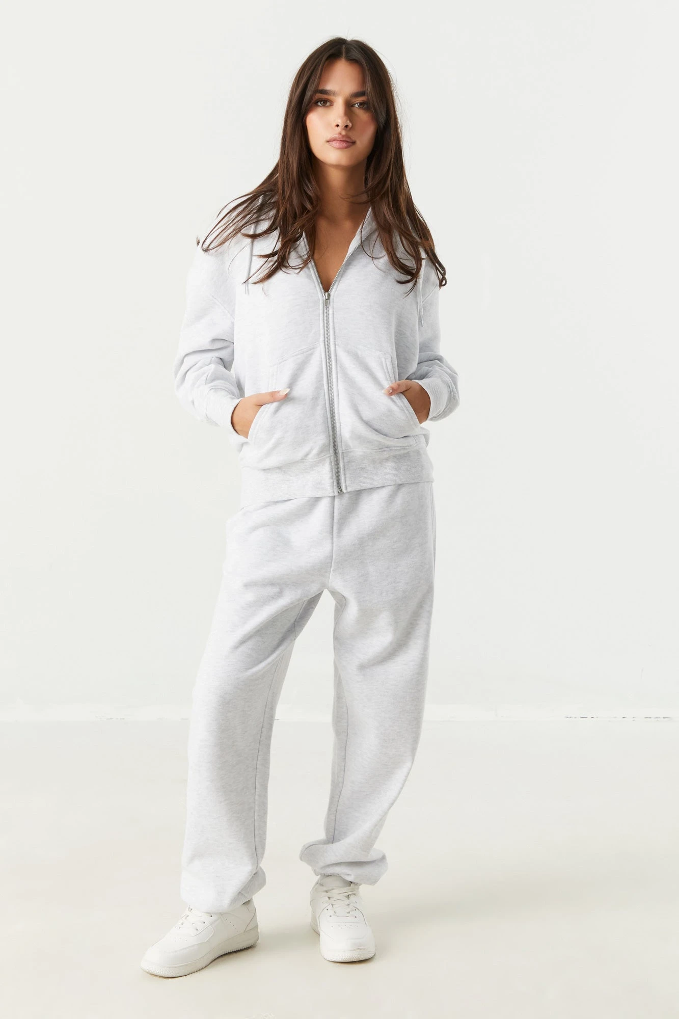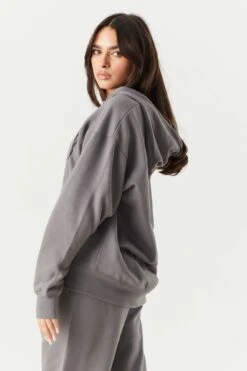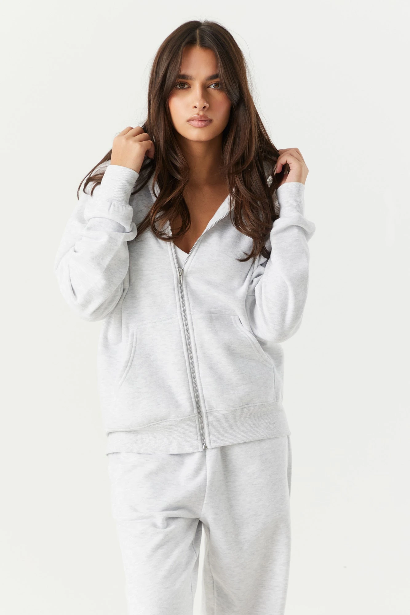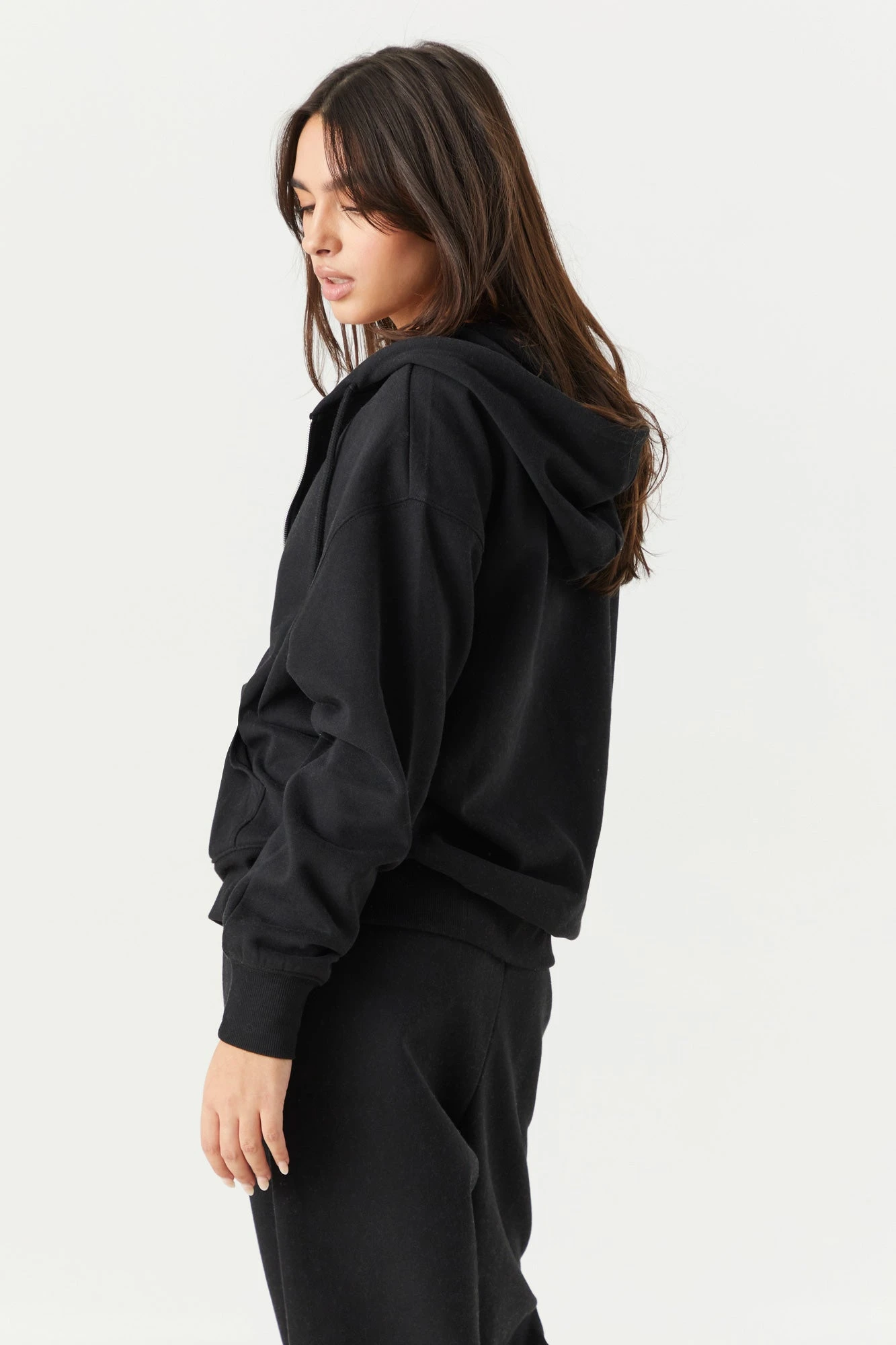 Kick back and get comfy in our oversized zip-up hoodie. This hoodie features fleece material, drawstring hood, zip-up front, long sleeves, ribbed knit cuffs and hem, and oversized fit.