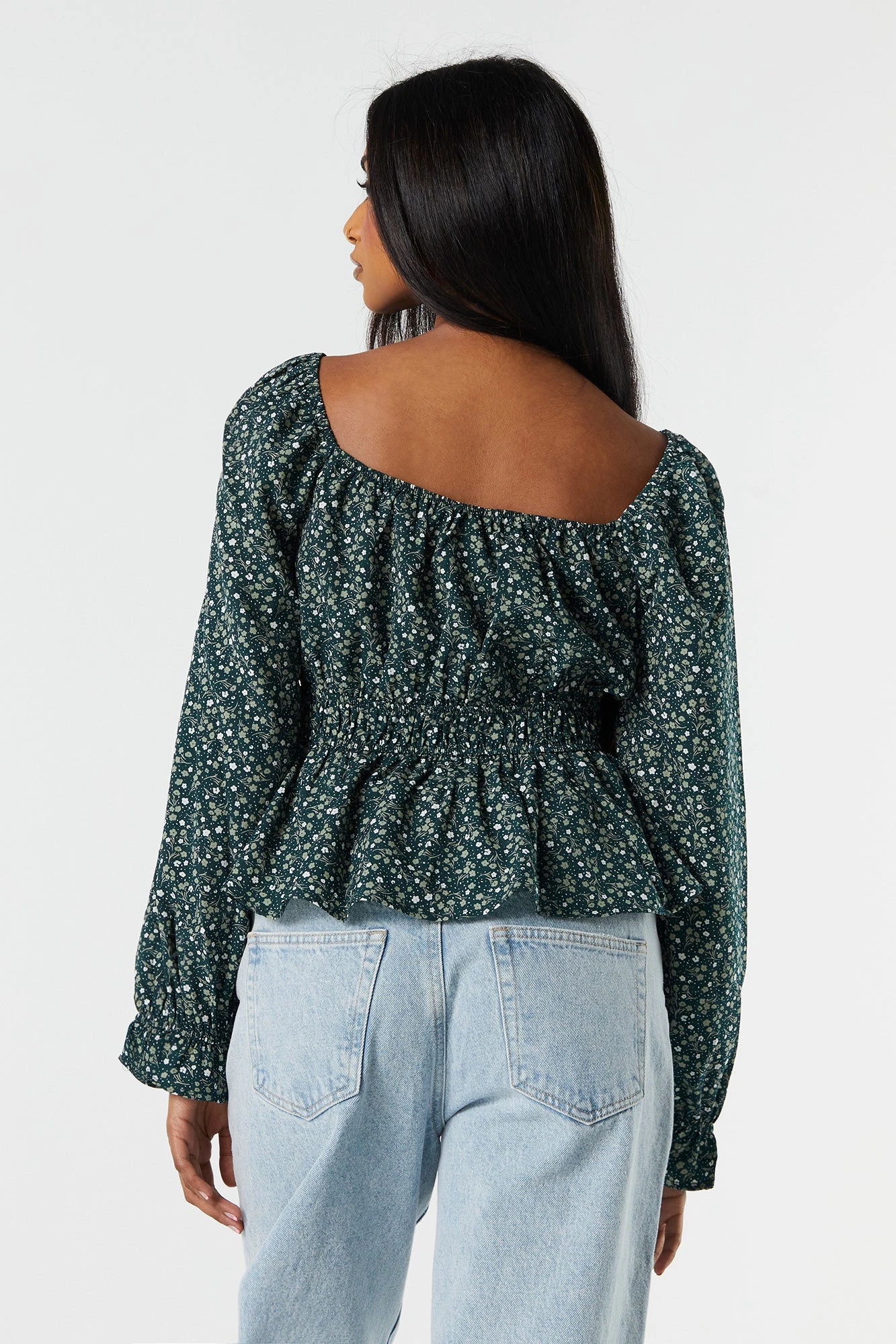 Own the spotlight in this versatile long sleeve. This top features floral print, elastic waist, long sleeves, V-neckline, and cinched wrists.
