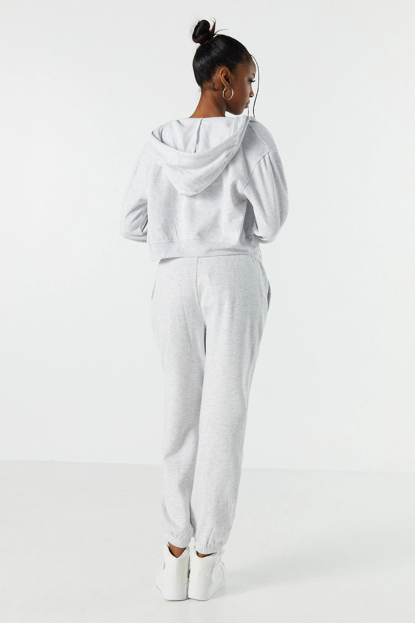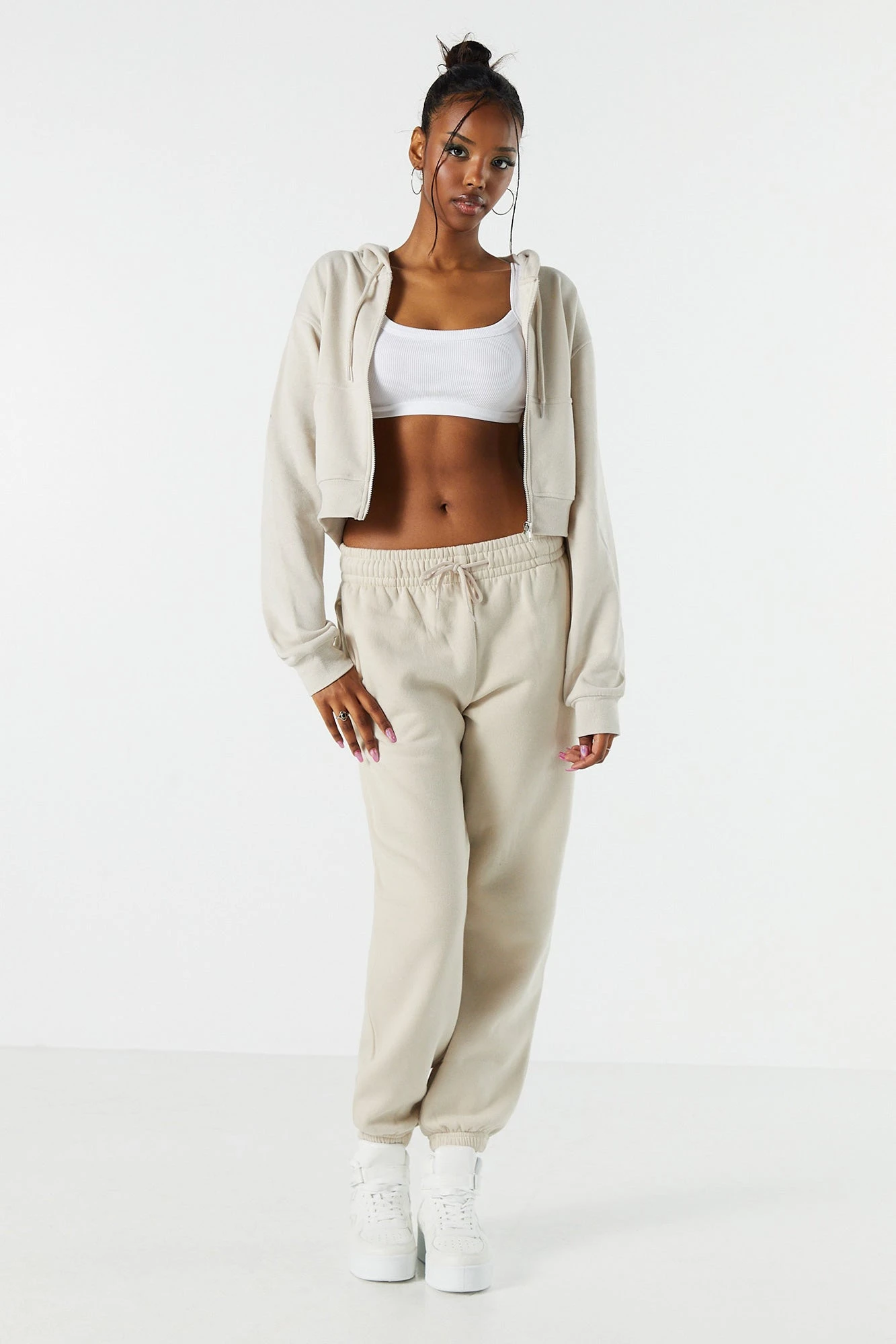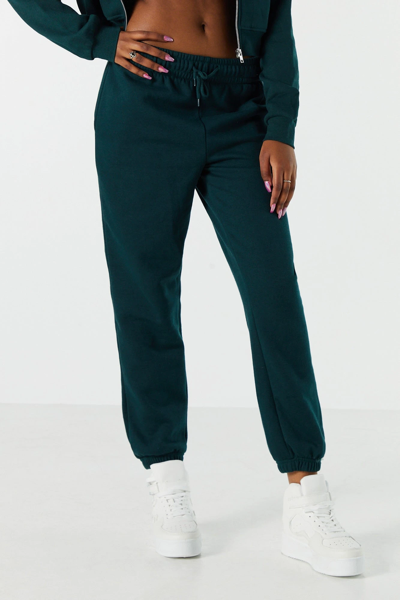 Update your off-duty wardrobe with this fleece jogger that is an everyday comfy and cute essential. This jogger features high-rise waist, fleece material, drawstring waist, slide-in pockets, and cinched ankles.