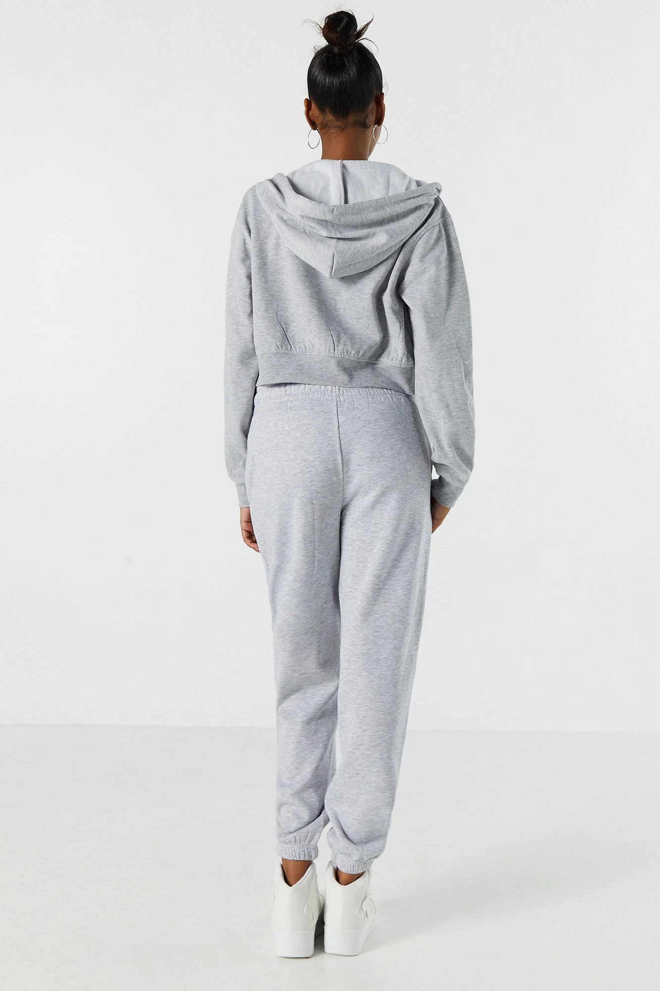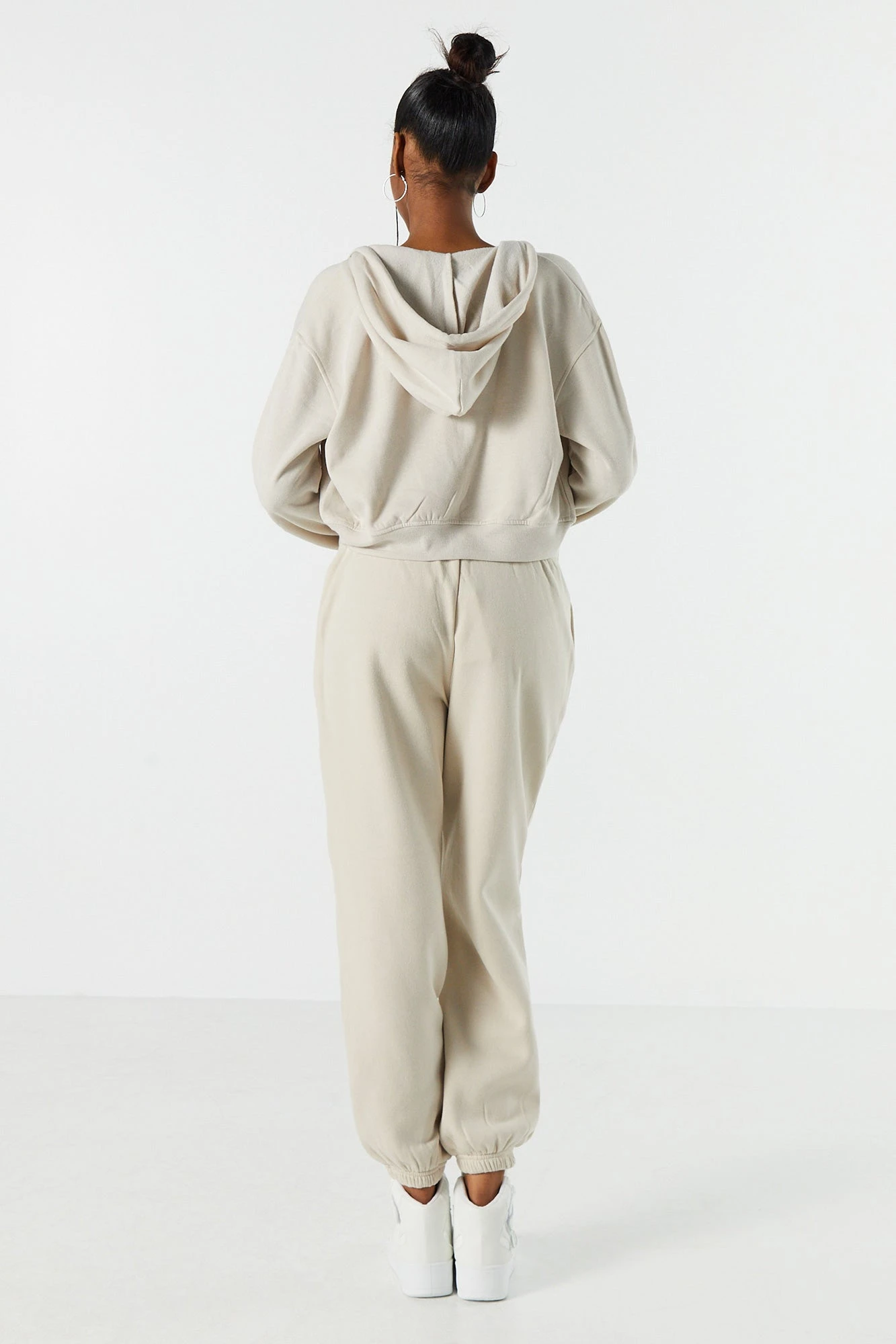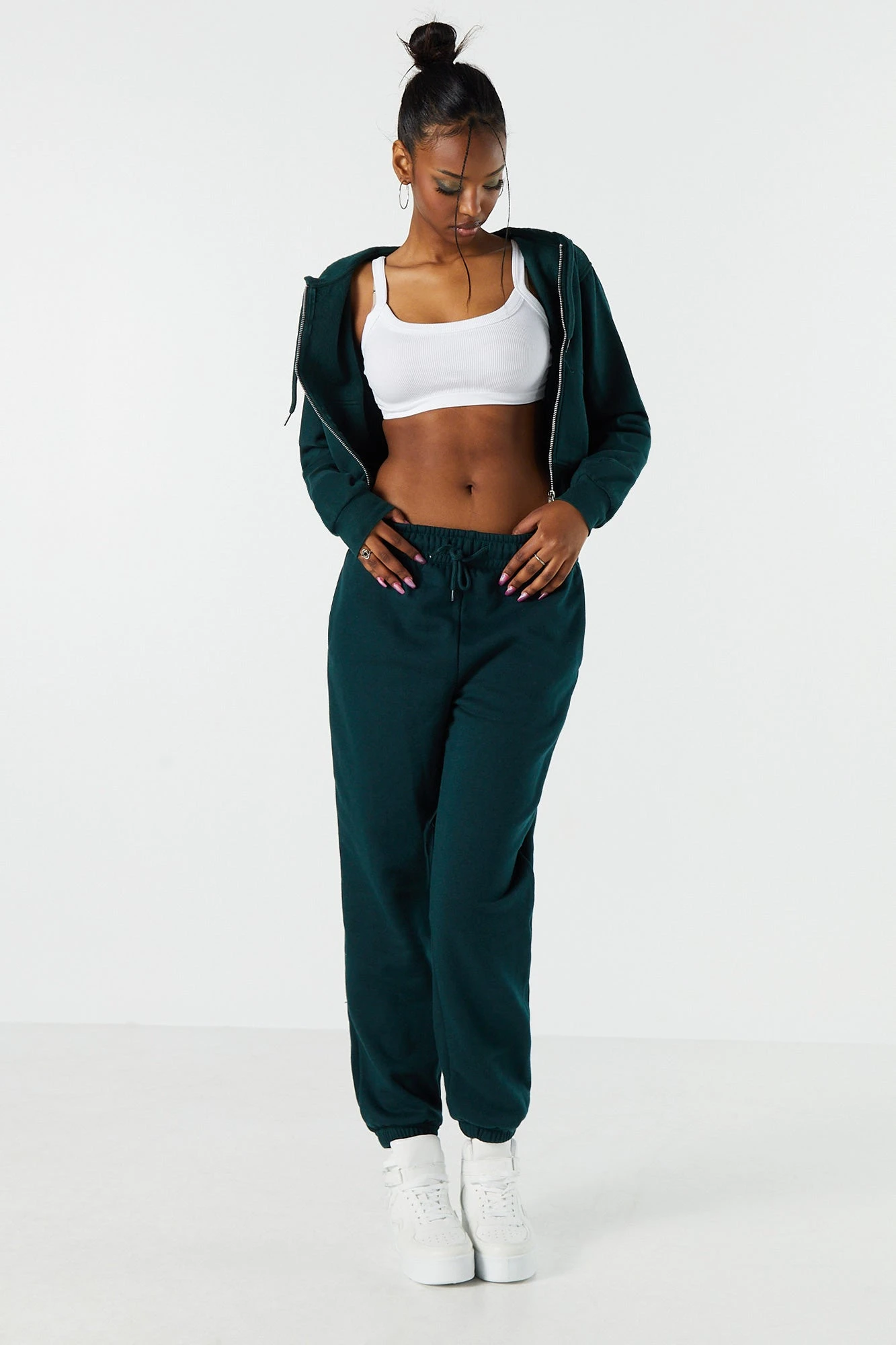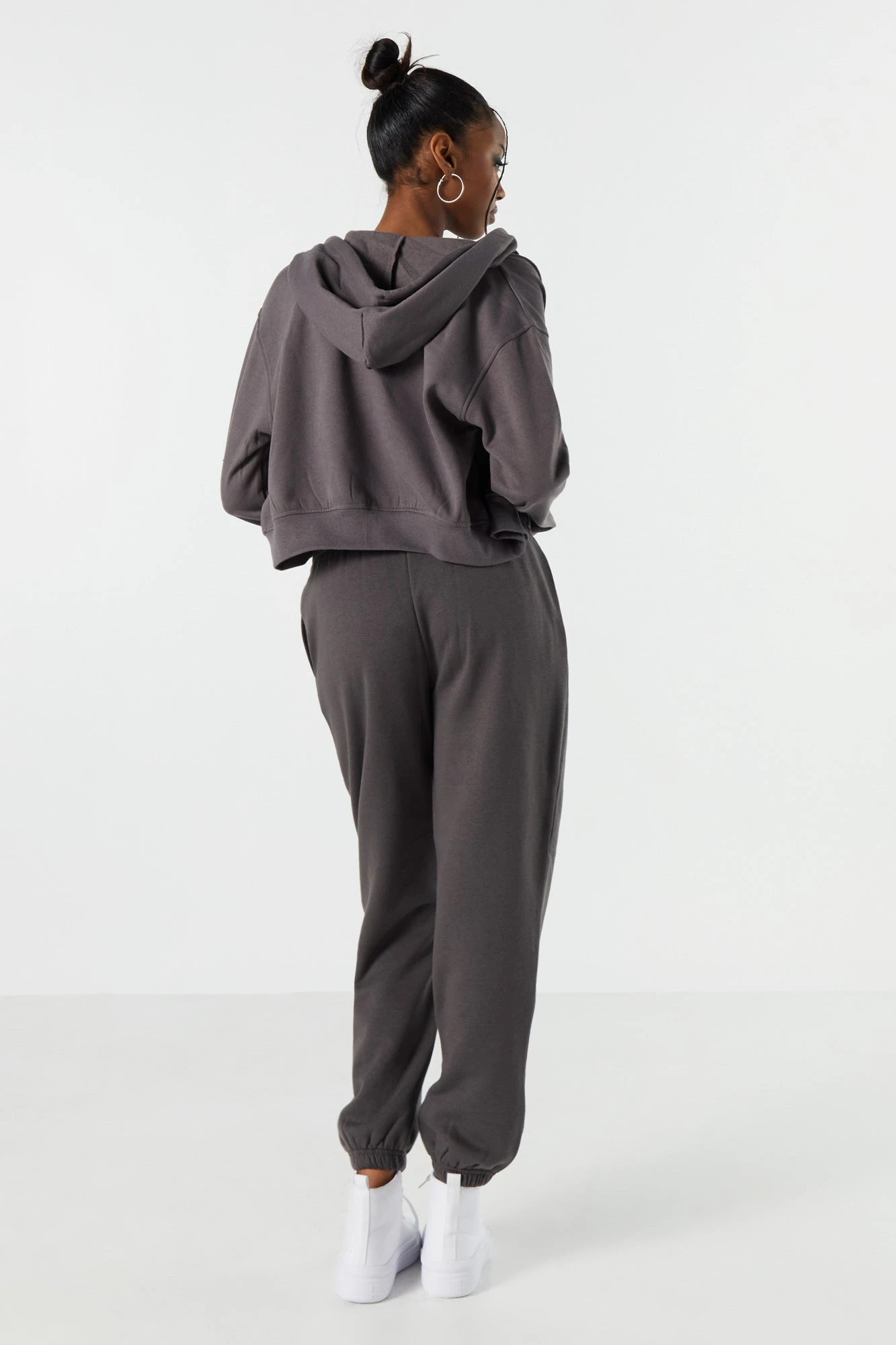Update your off-duty wardrobe with this fleece jogger that is an everyday comfy and cute essential. This jogger features high-rise waist, fleece material, drawstring waist, slide-in pockets, and cinched ankles.