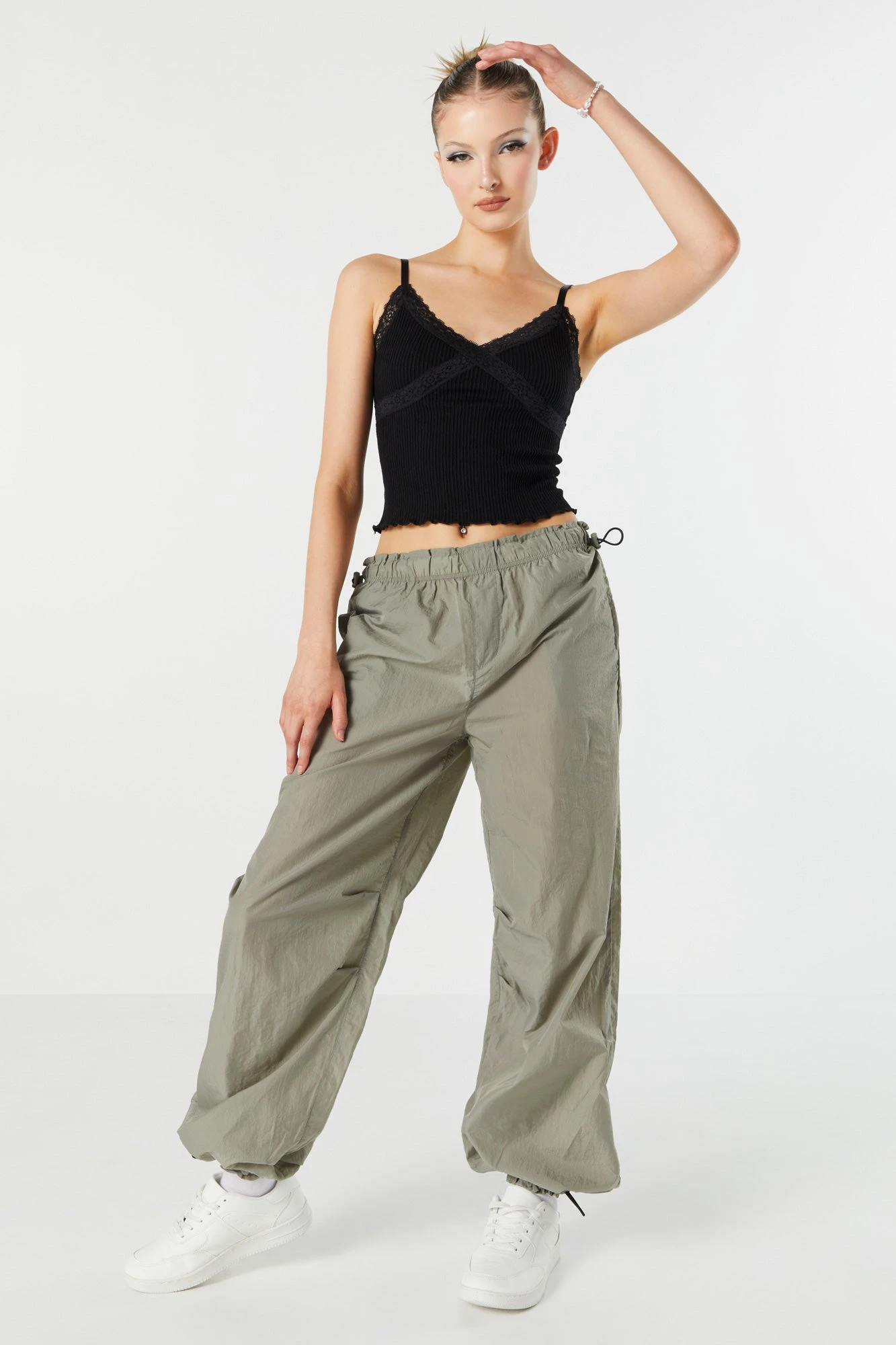 Parachute pants are back – and they’re making a statement! This pant features Nylon material, low-rise elastic bungee waist, cinched bungee ankles, and parachute leg. Size runs small.