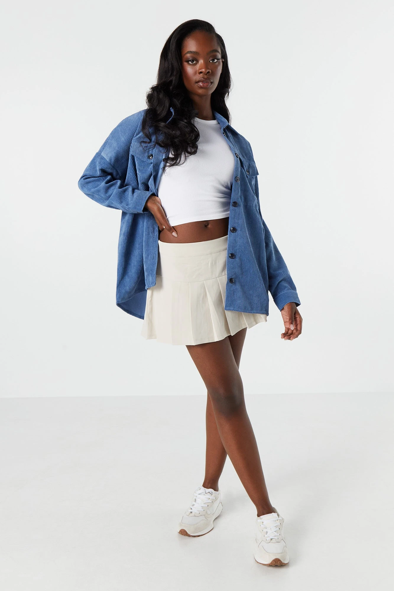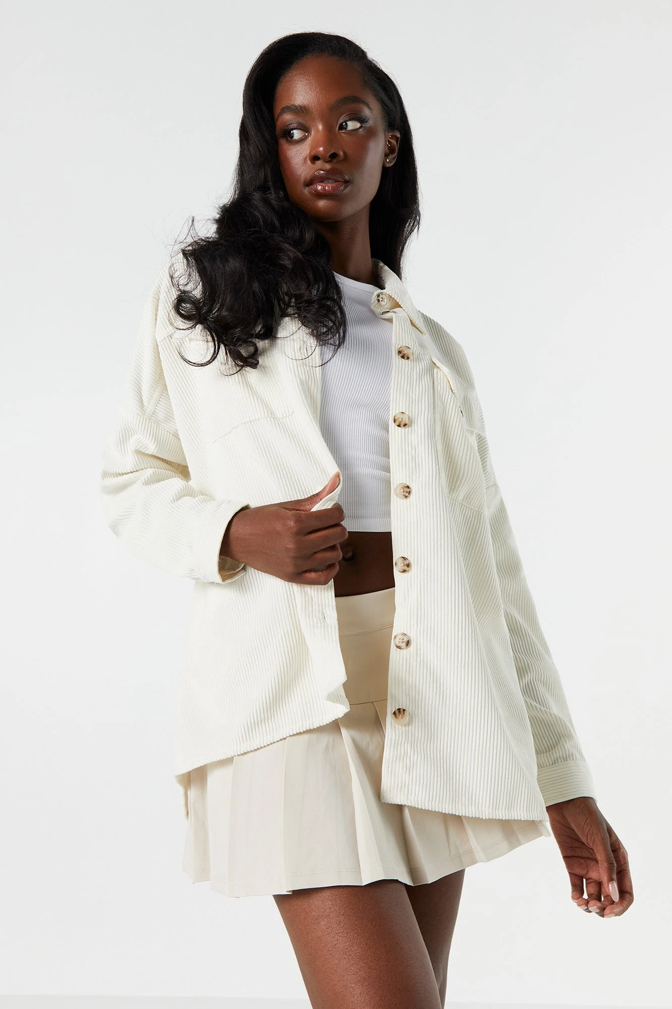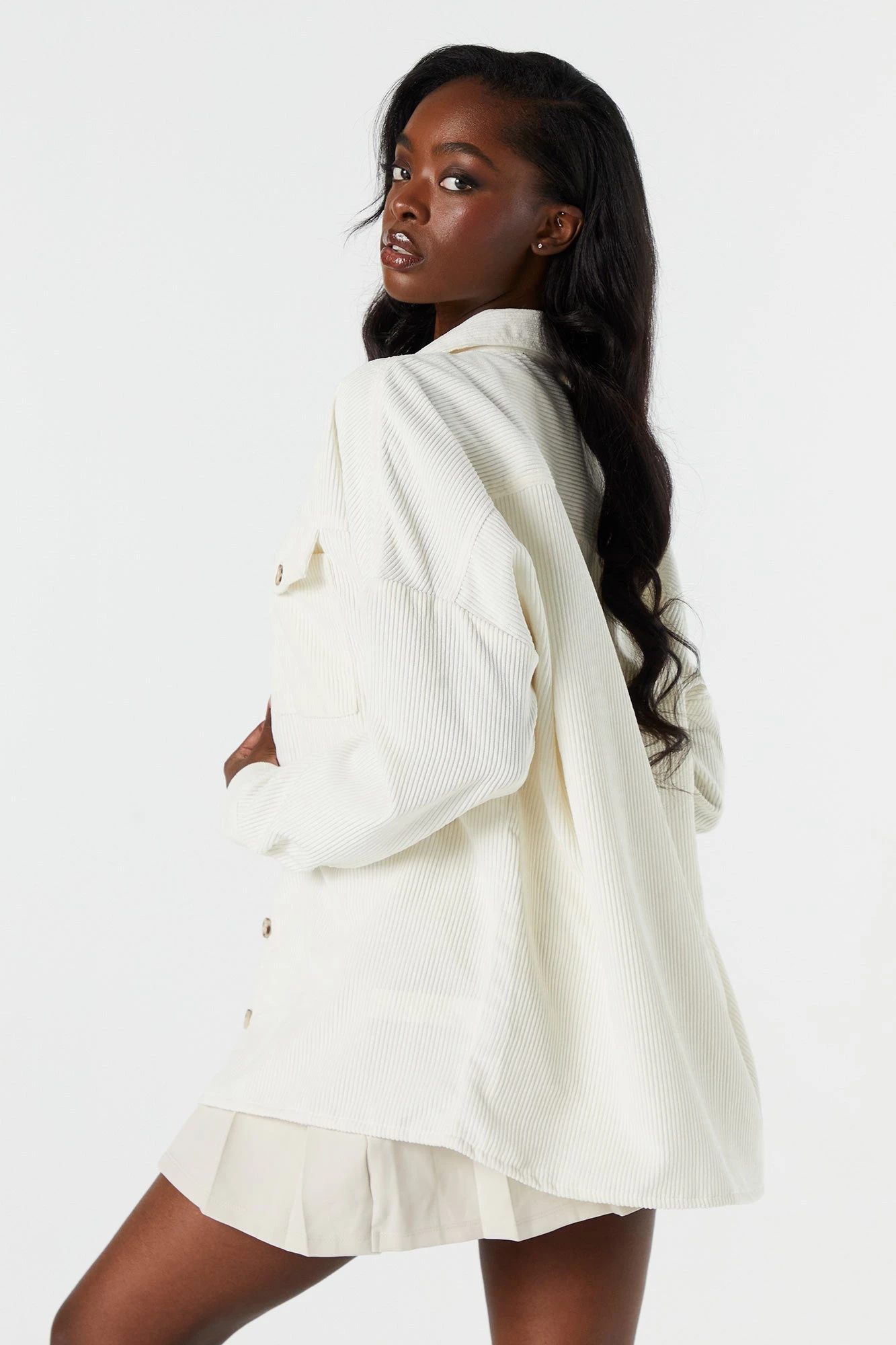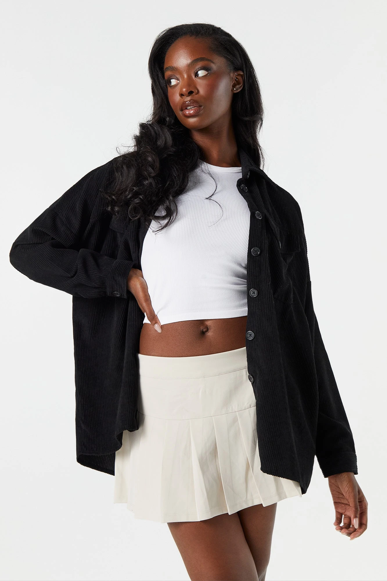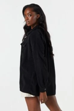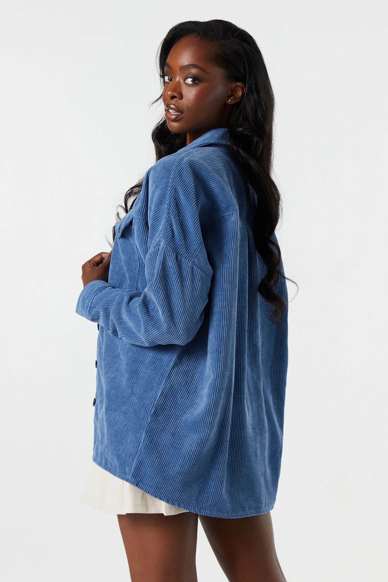 We’re living for the layers! This top features corduroy material. Button-up front, collared neckline, long sleeves, and oversized fit. Size runs small.