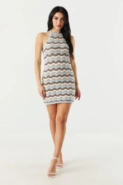 This dress feature crochet knit, halter neck, all over print and mini fit. Size runs small.