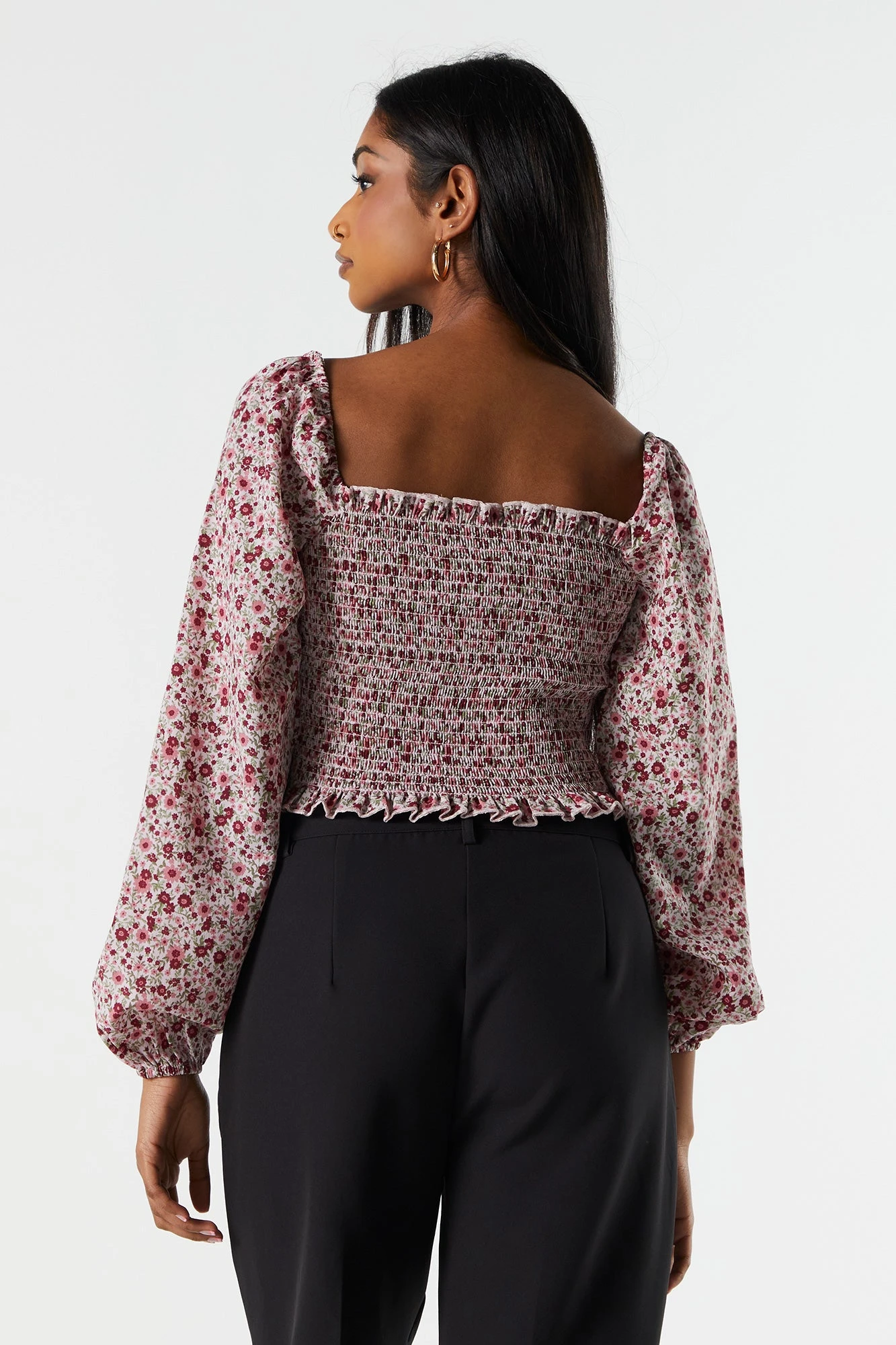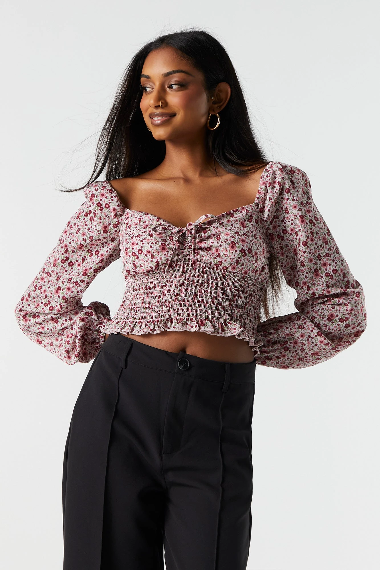 This floral milkmaid top is bringing out our romantic side, and we’re not mad about it! This top features floral print, milkmaid construction, sweetheart neckline, tie front, smocking, long sleeves, and cinched wrists. Size runs small.
