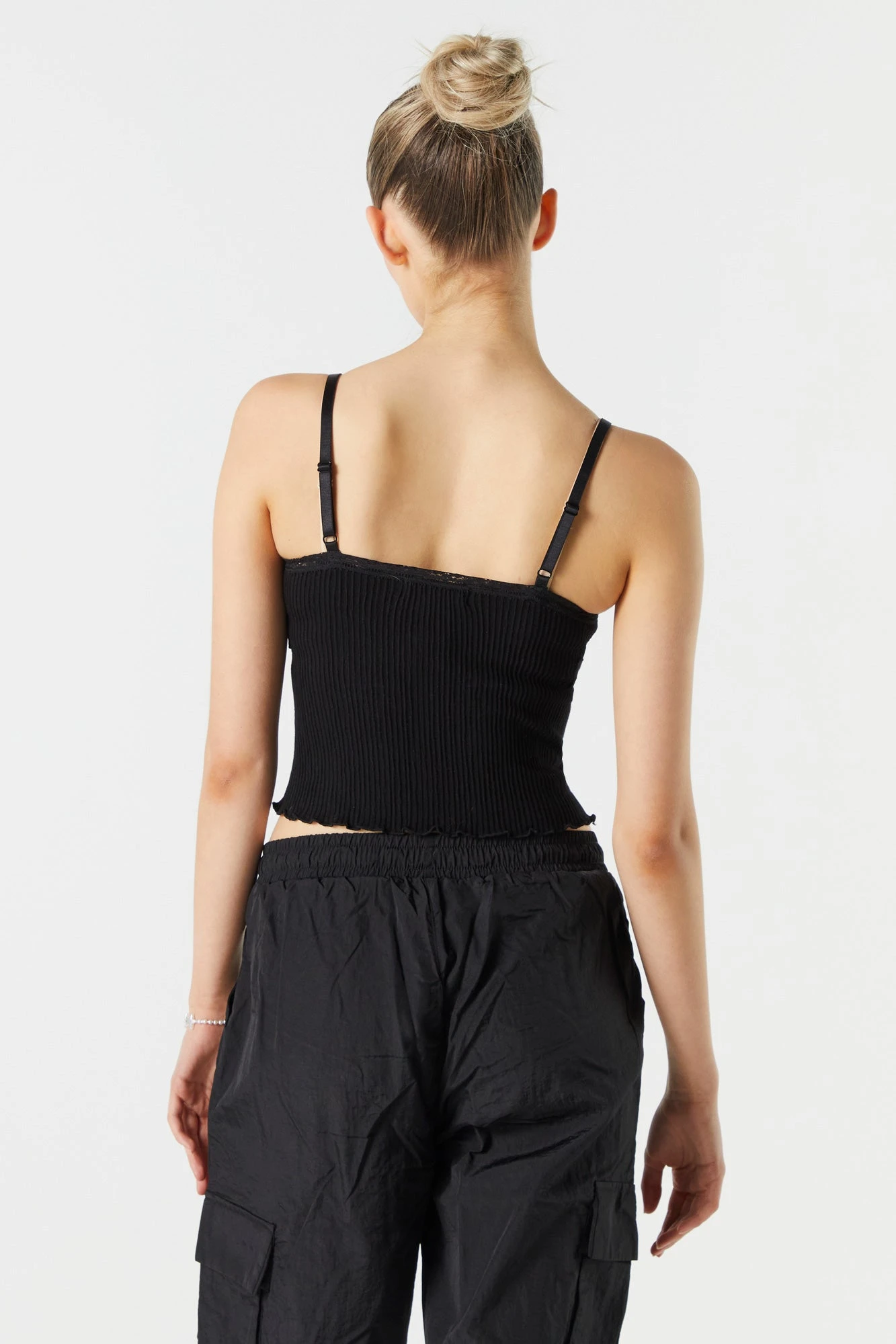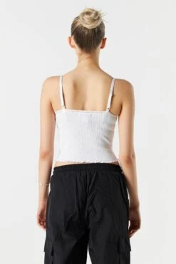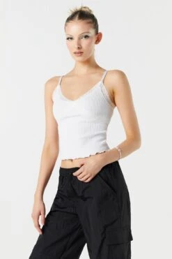 Add this lace trim tank to your collection for multiple wears and endless styling opportunities! This tank features seamless construction, lace trim, all-over ribbing, V-neckline, and adjustable cami straps. Size runs small.