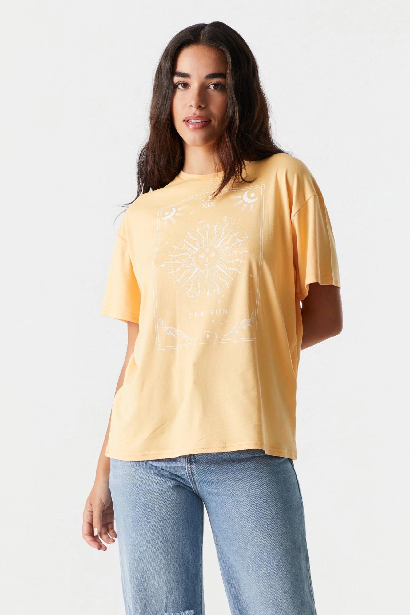 You destiny awaits you! Do what you were put on this earth to do… be stylish. This t-shirt features crewneck, short sleeves, boyfriend fit and the sun tarot card graphic.Size runs small.
