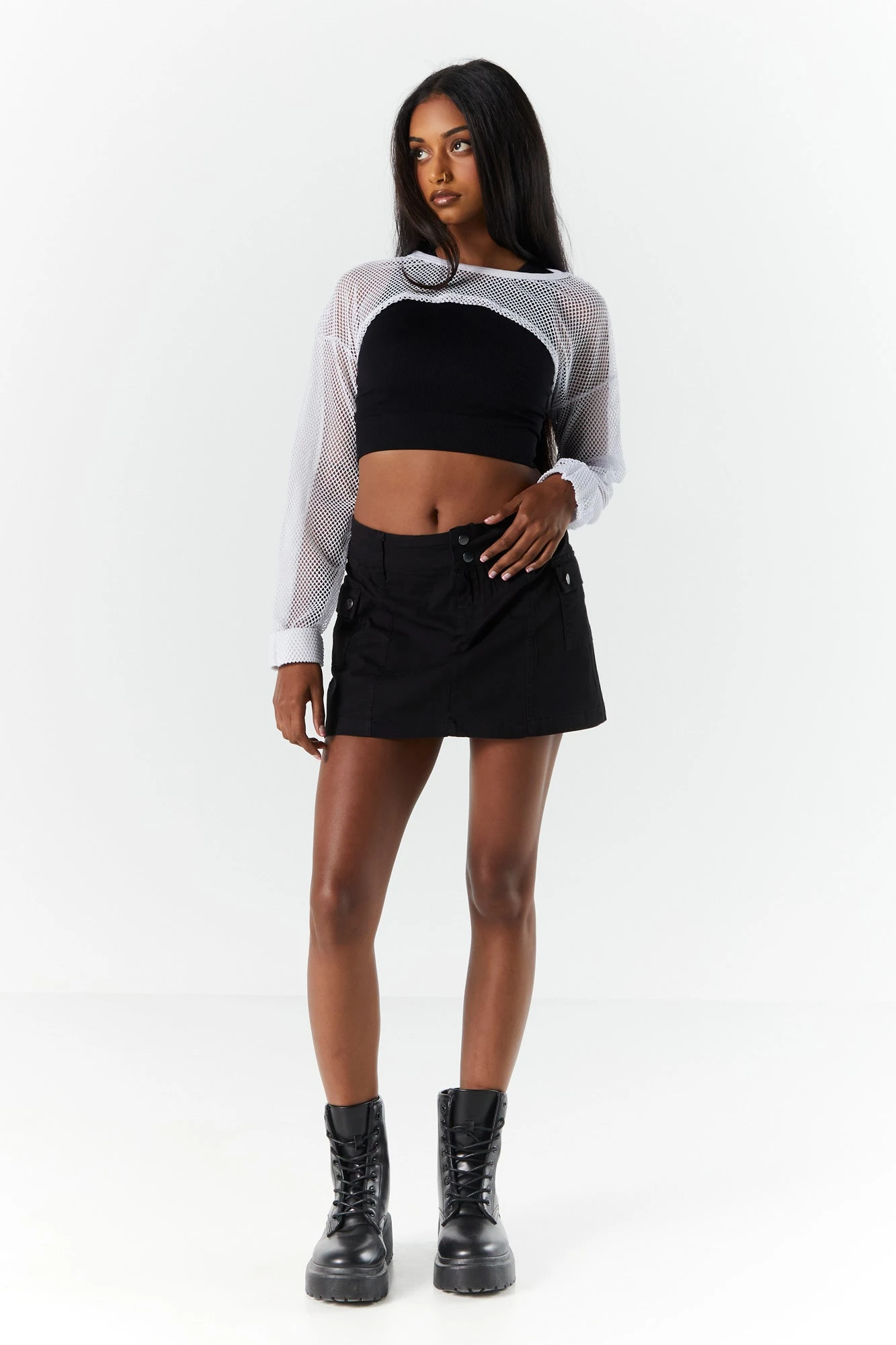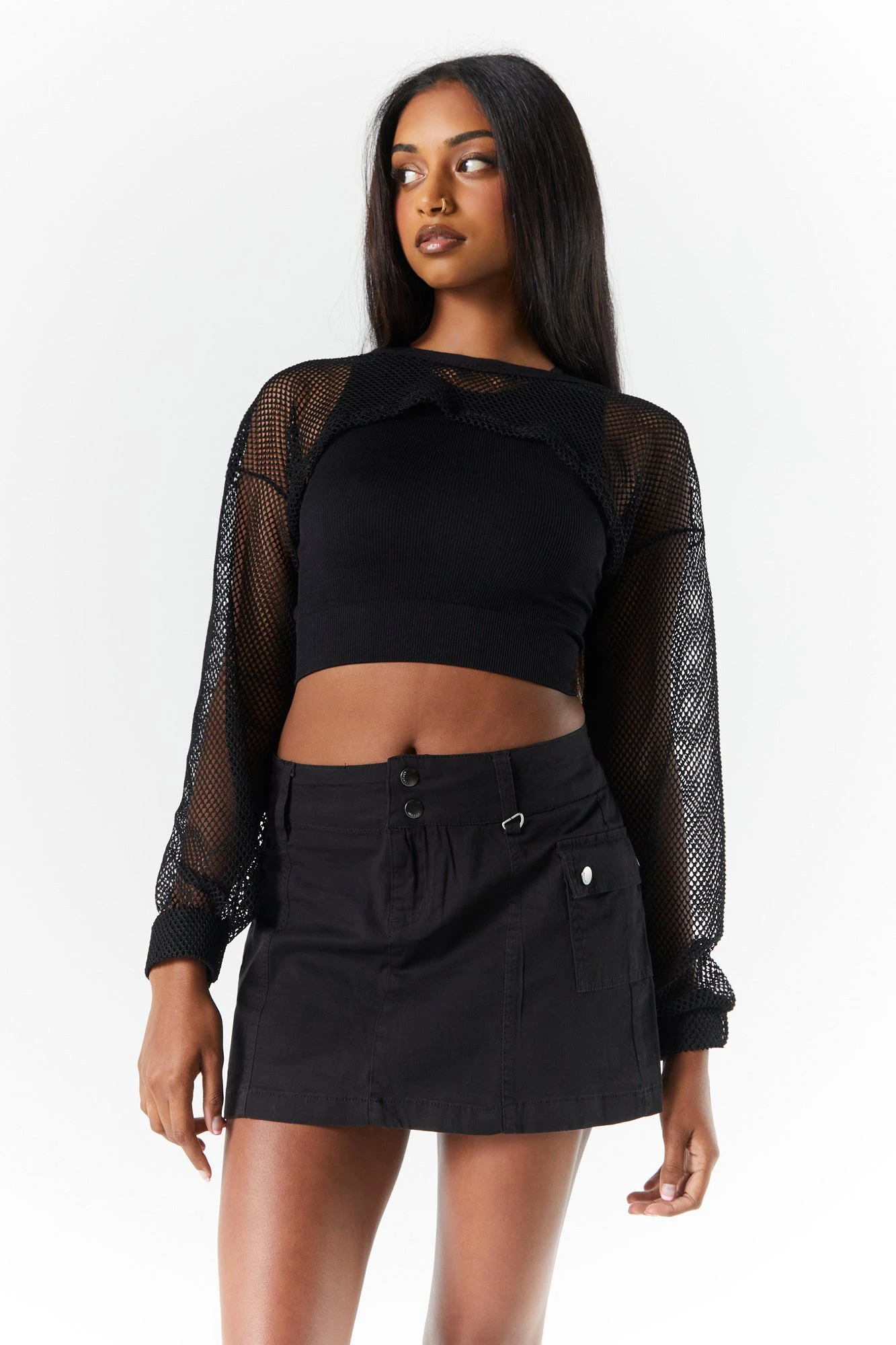 Get the festival look with this fishnet shrug that is the perfect layering piece for your next fit! This shrug features ultra-cropped fit, long sleeves, high neck, and fishnet material. Size runs small.