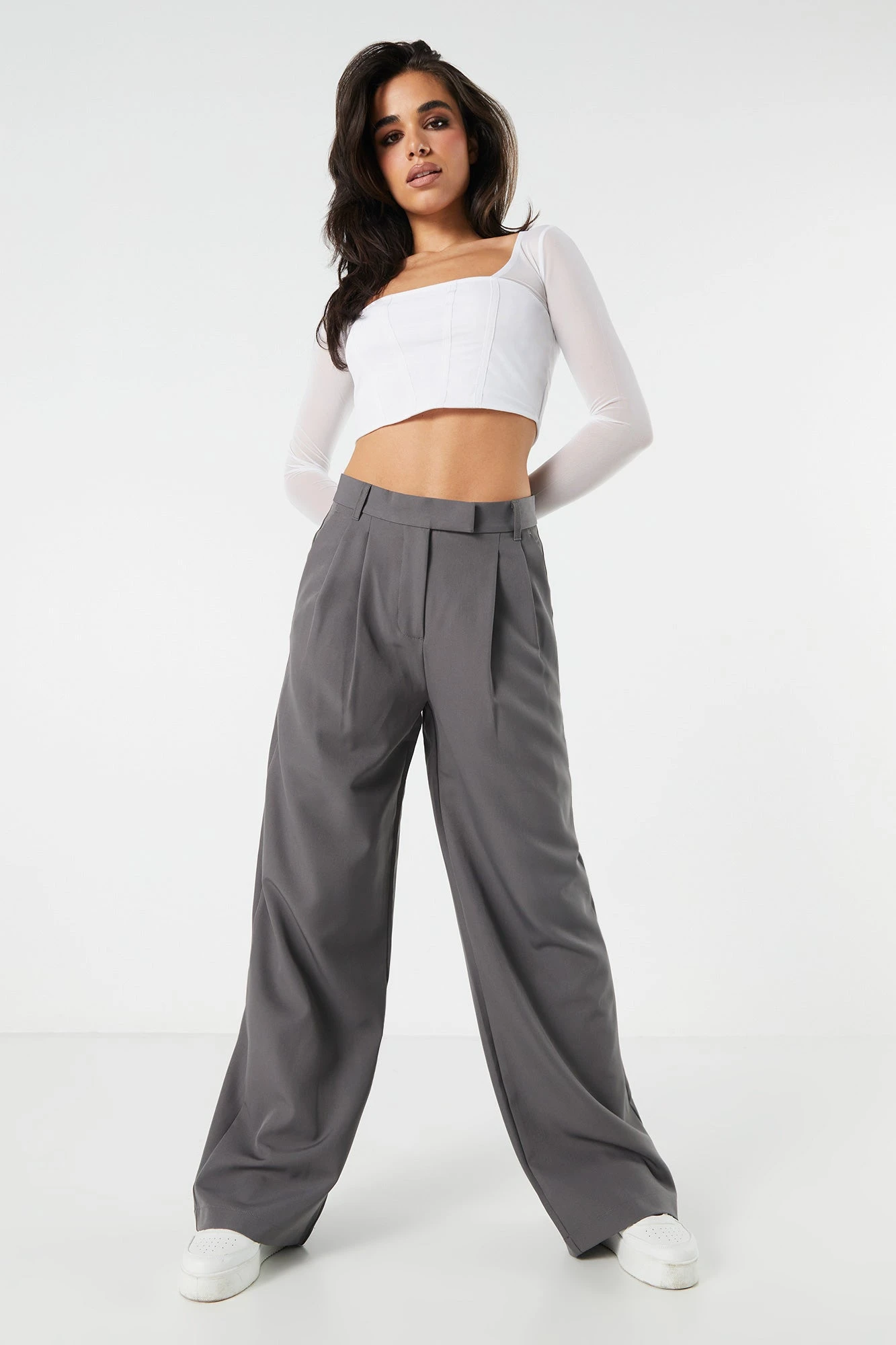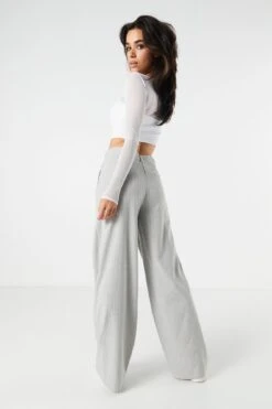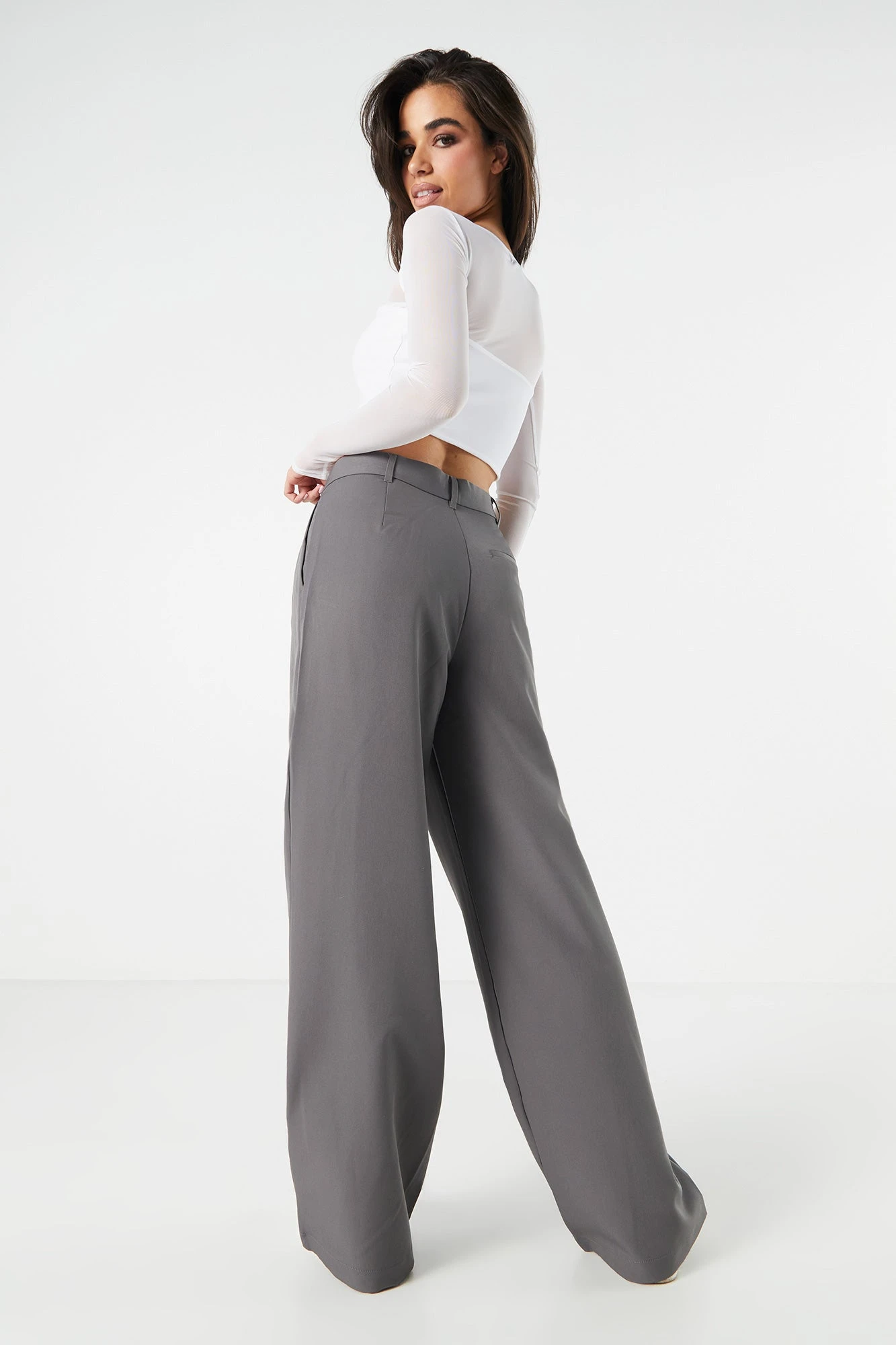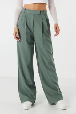 Look the part in our wide leg dress trouser. This pant features wide leg, high-rise fit, zip-fly closure, pleating, belt loops, and pockets. Size runs small.