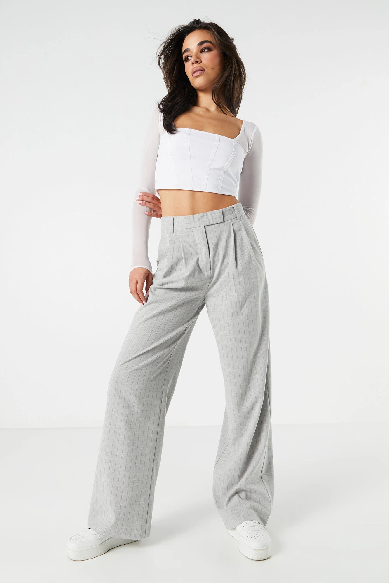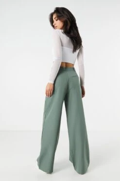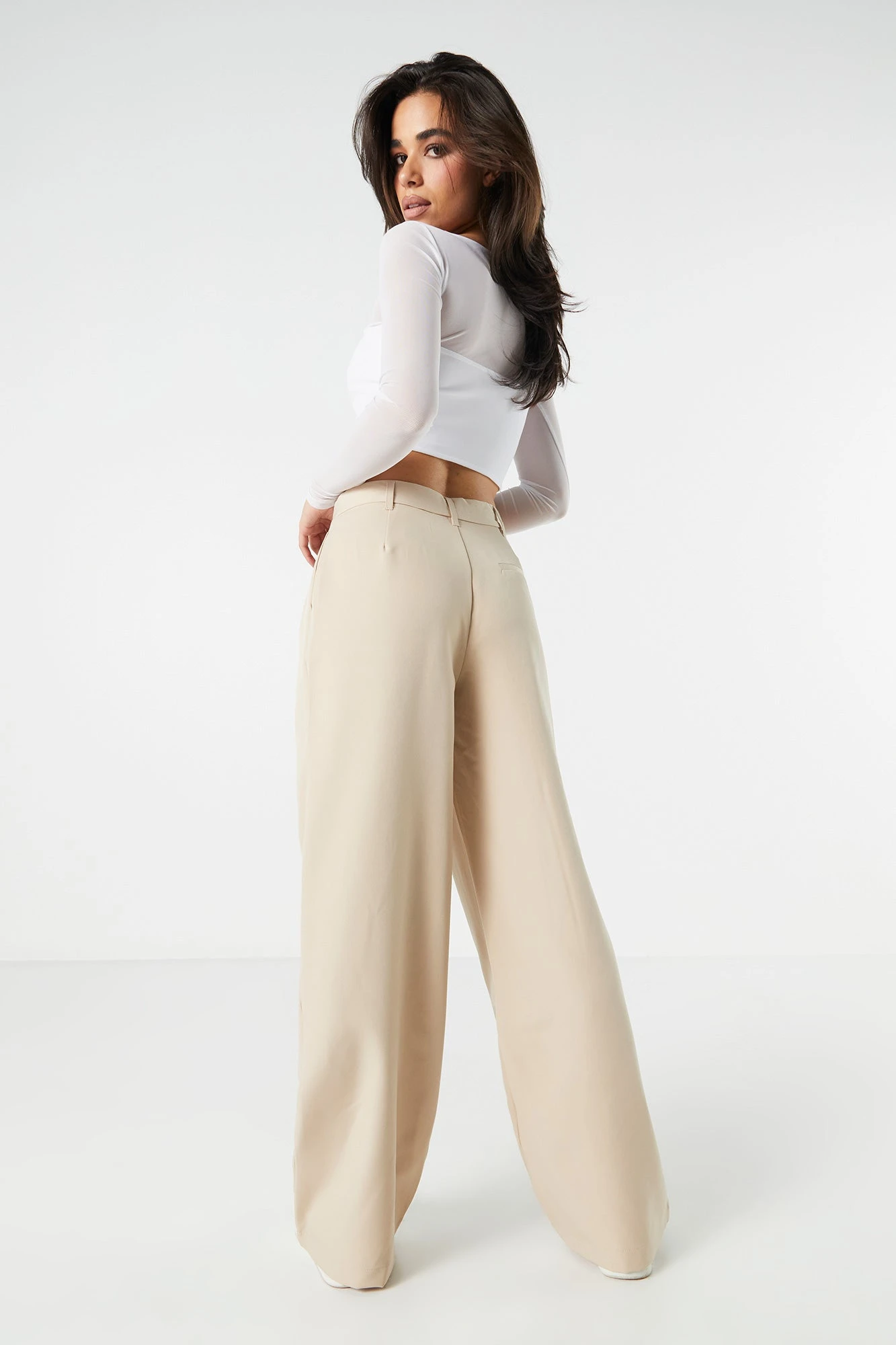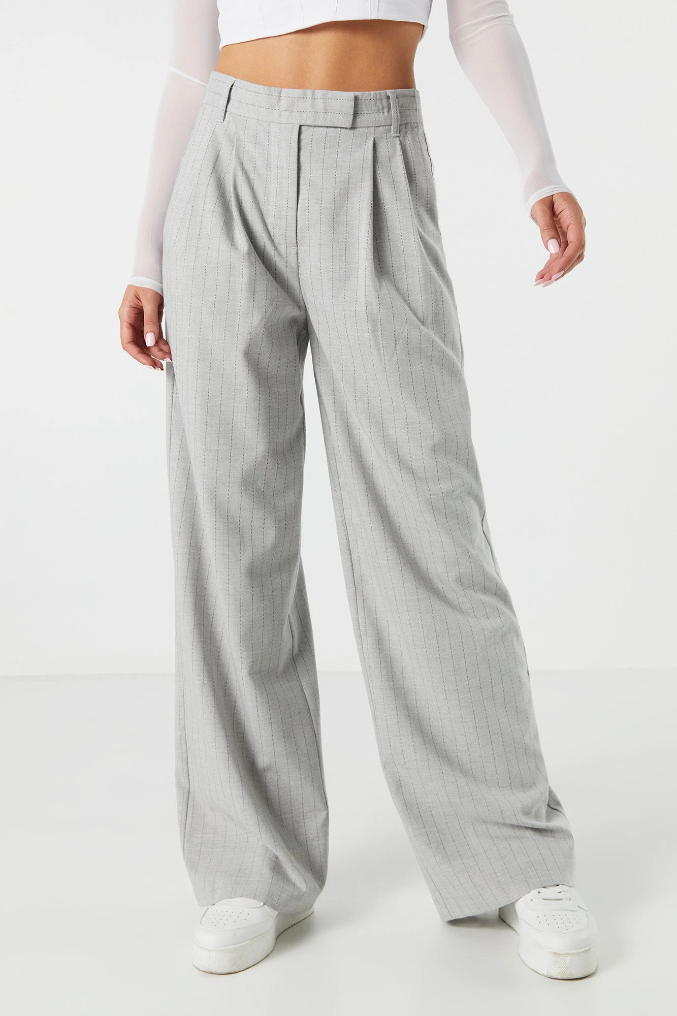 Look the part in our wide leg dress trouser. This pant features wide leg, high-rise fit, zip-fly closure, pleating, belt loops, and pockets. Size runs small.